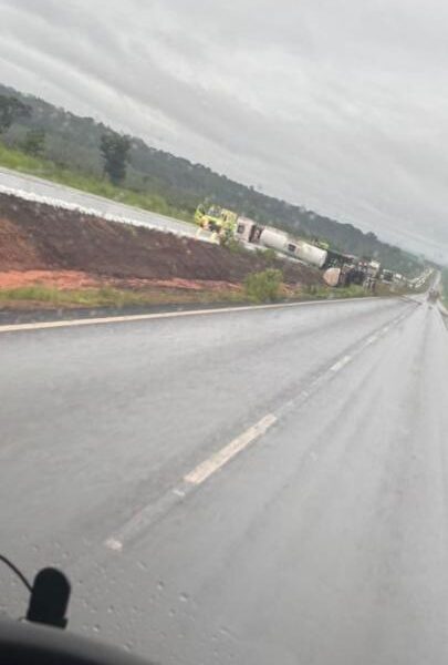 Carreta-tanque tomba na BR-163 e bloqueia rodovia por horas